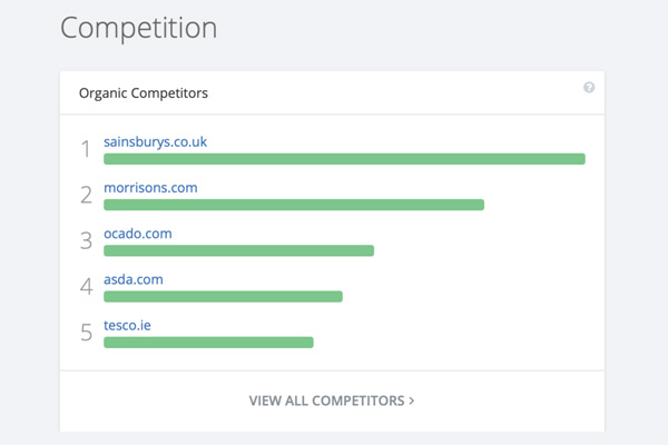 Using Spyfu, you can discover your competitors’ most profitable keywords and find out whether they’re ranking for paid or organic keywords. We ran a search on Tesco, which reveals their keyword count, paid keyword count, and top competitors.